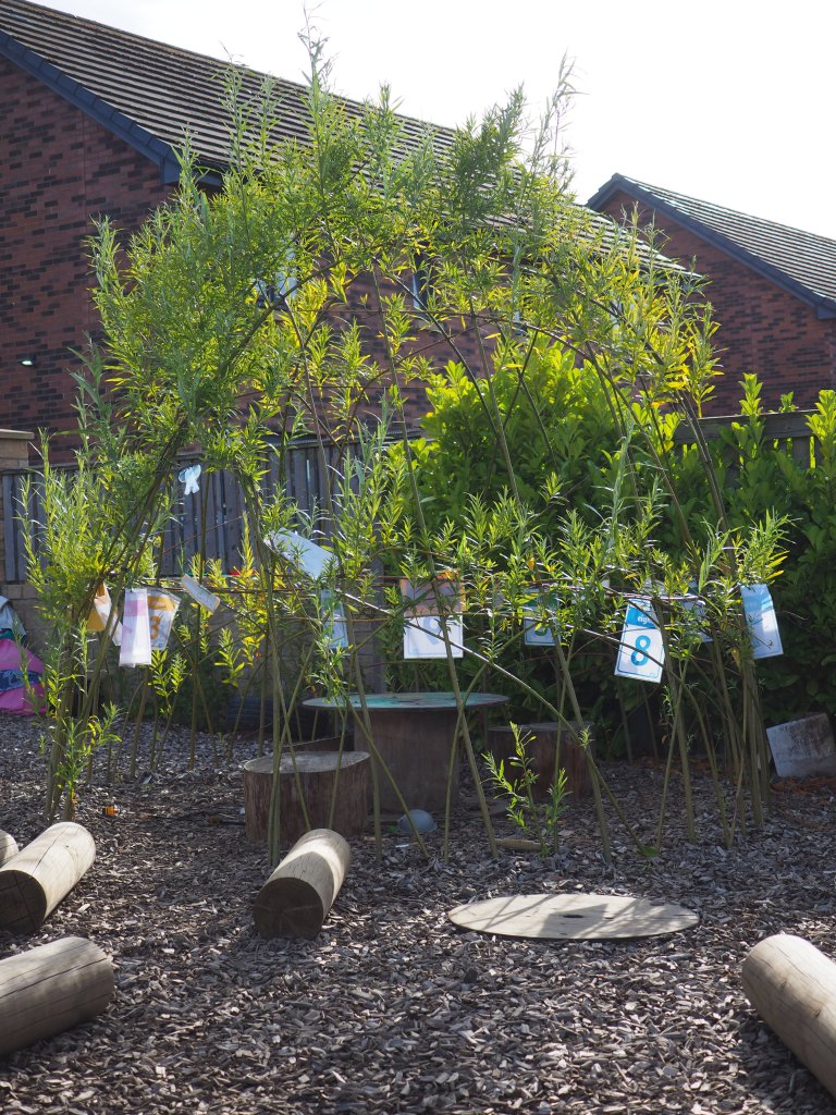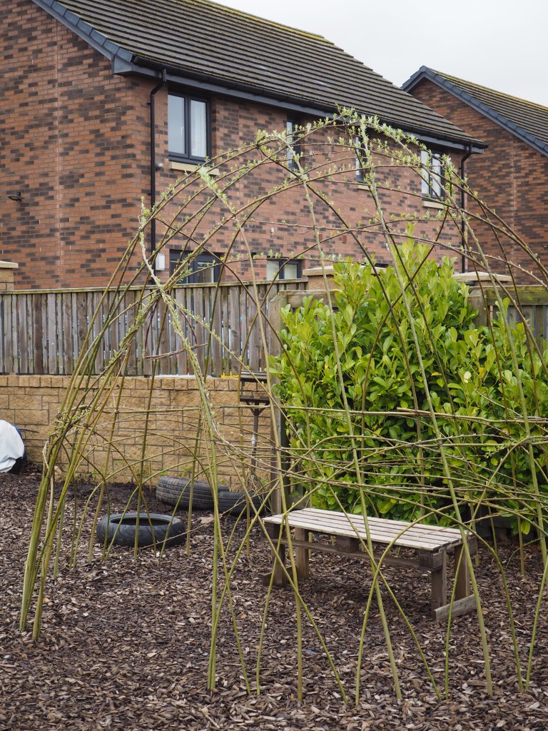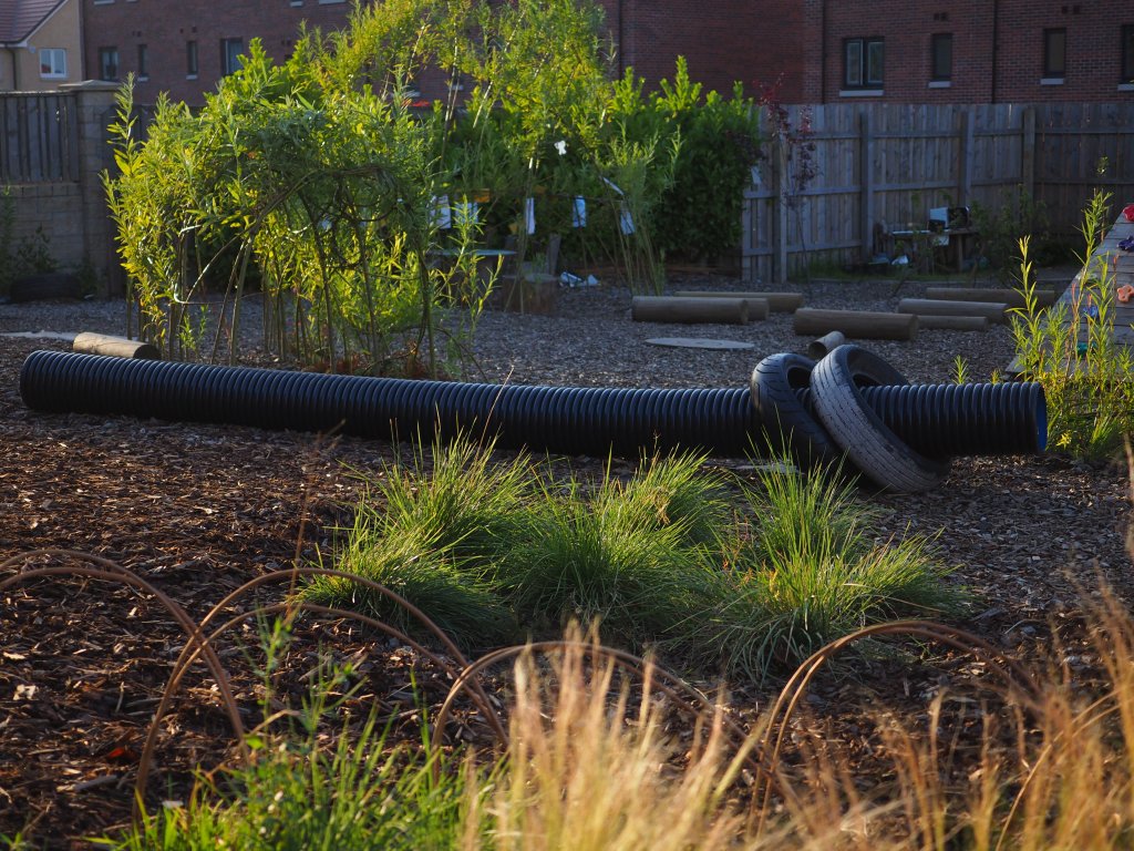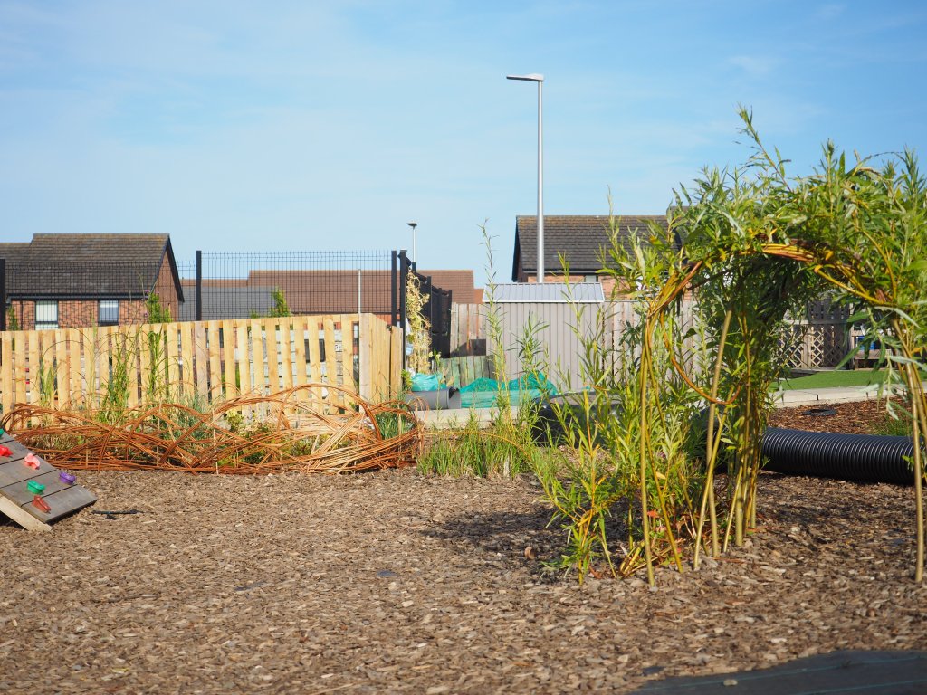 The brief: change the play space to include plants, enclosed spaces for the children to have a bit of peace and time to read, veg growing beds, a fire pit and sensory planting.