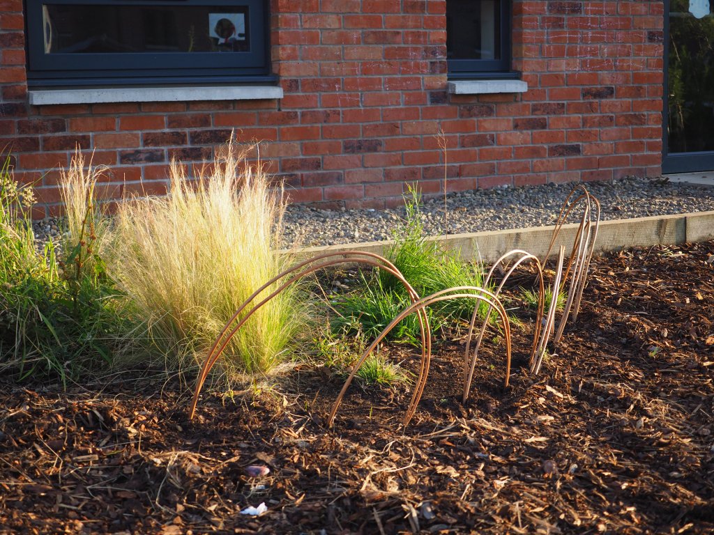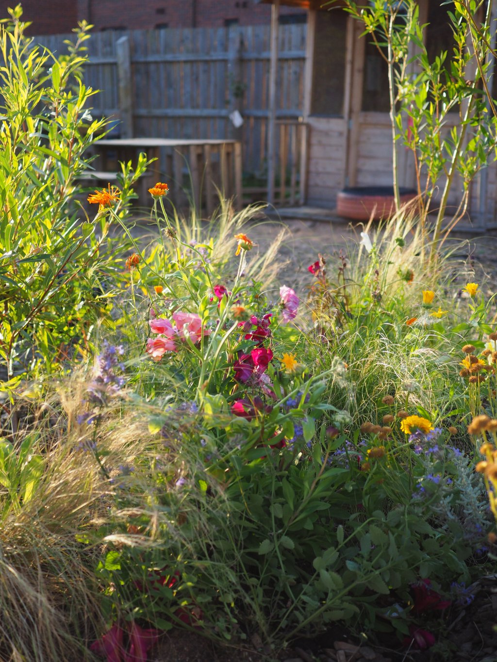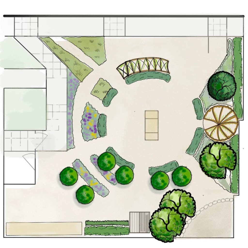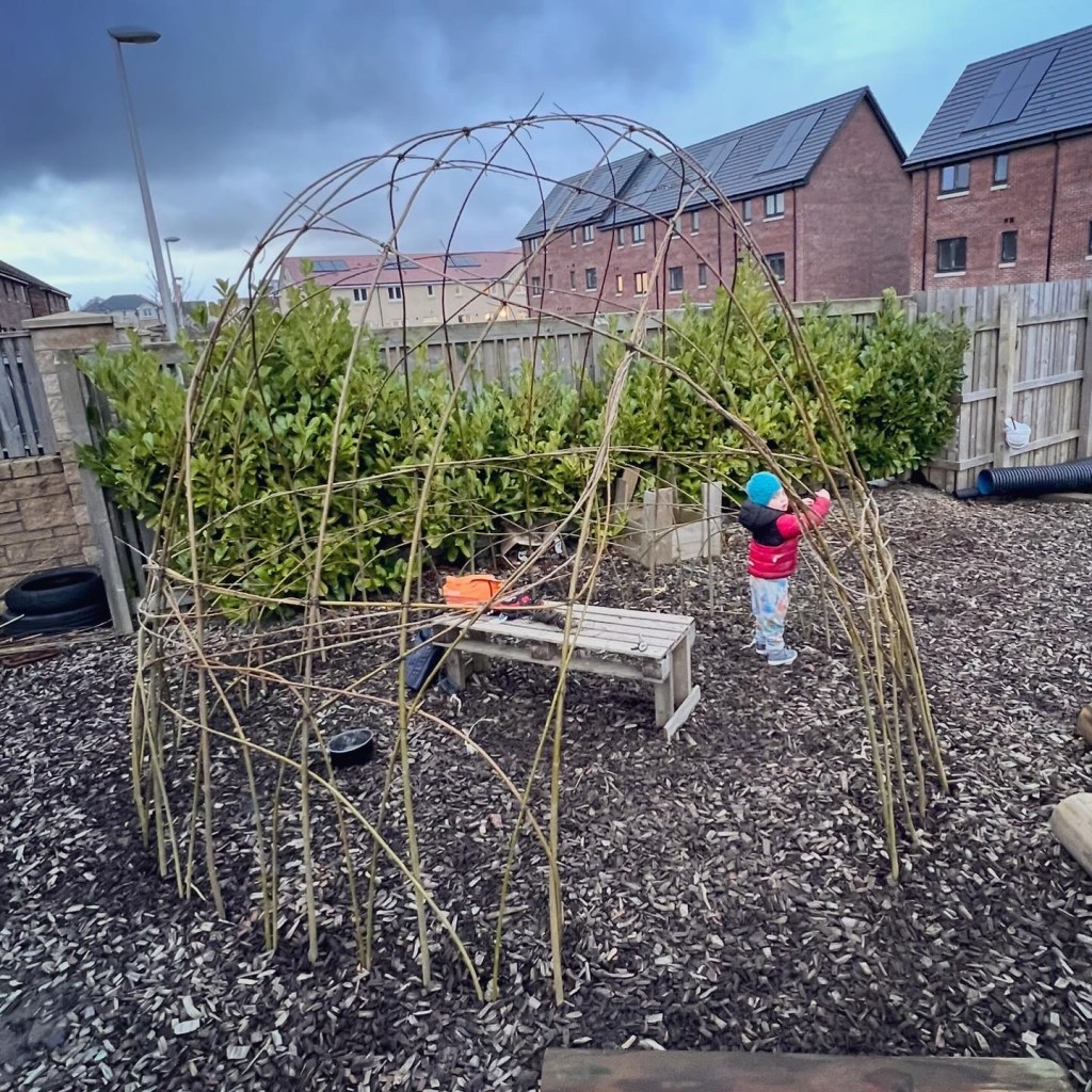 The brief: change the play space to include plants, enclosed spaces for the children to have a bit of peace and time to read, veg growing beds, a fire pit and sensory planting.