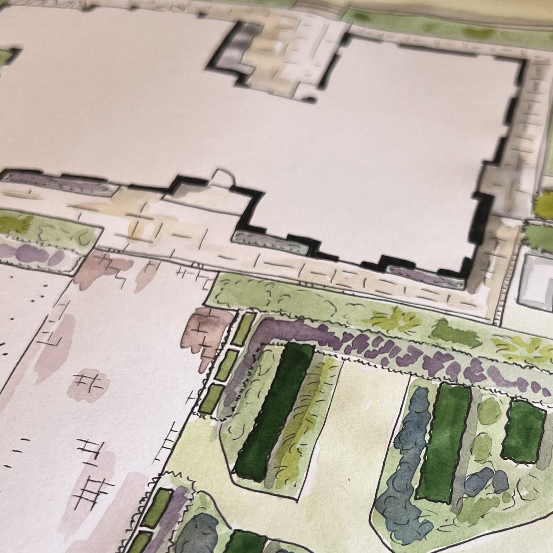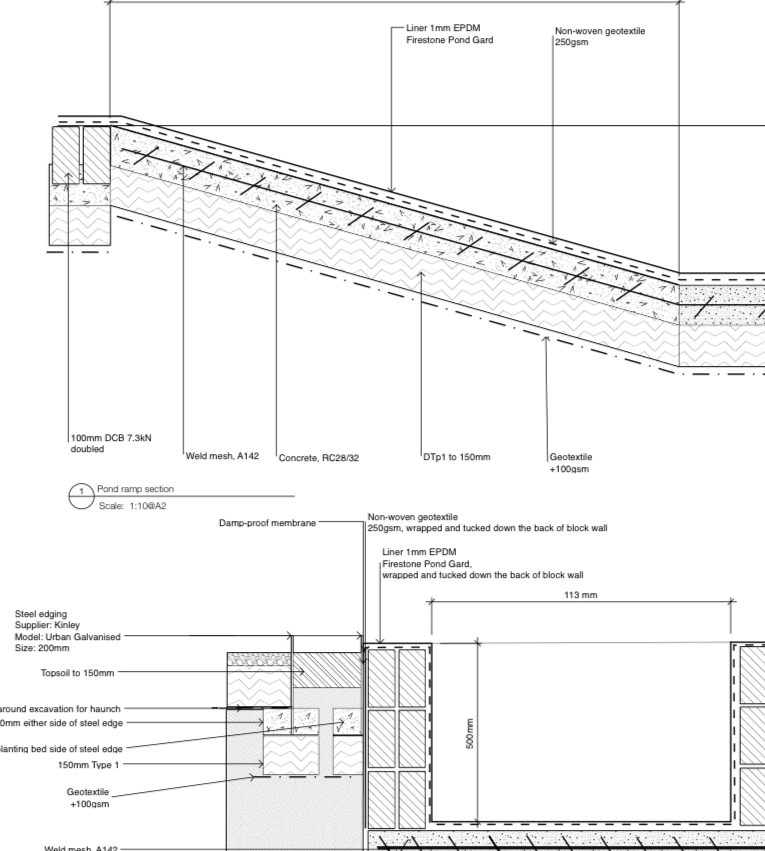 A proper garden design involves full scale drawings of the space with precise measurements for hard landscaping, materials schedules and construction details for every element.